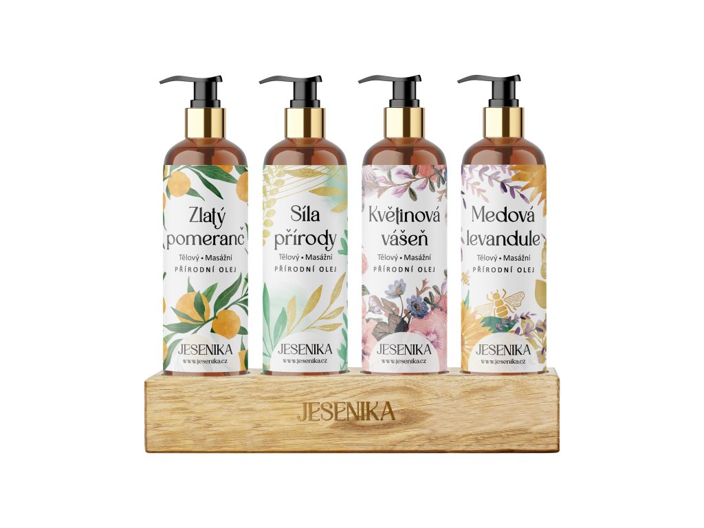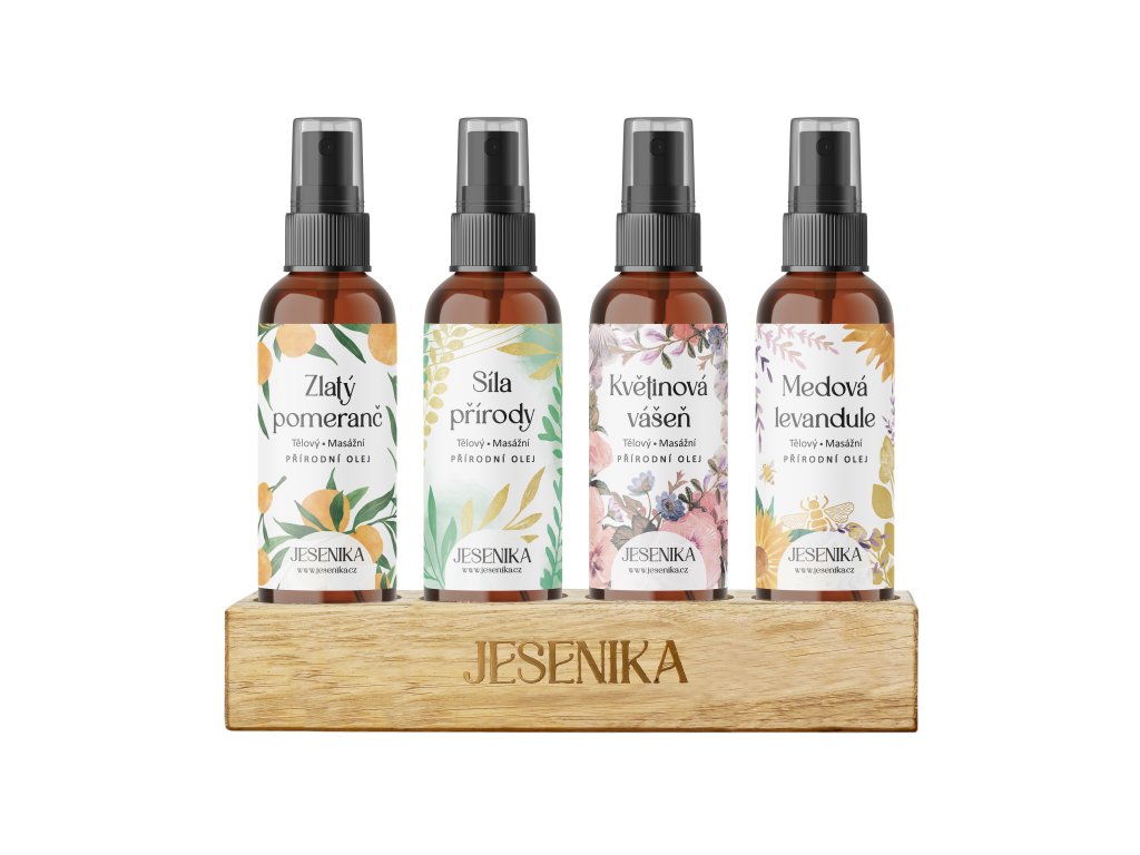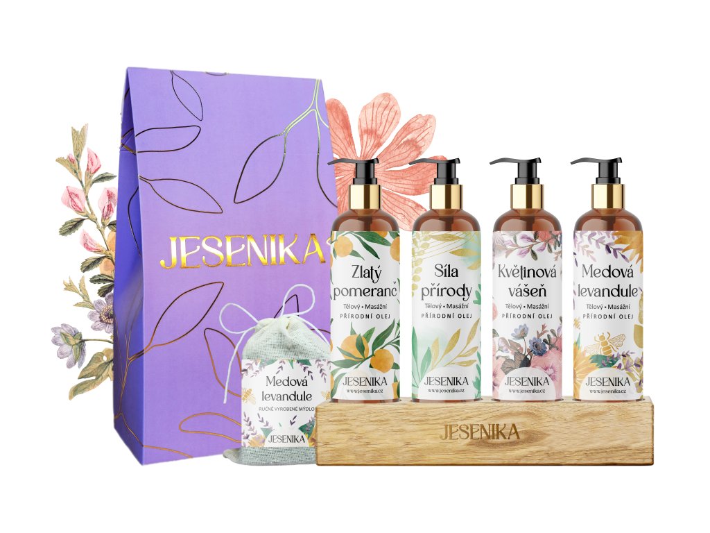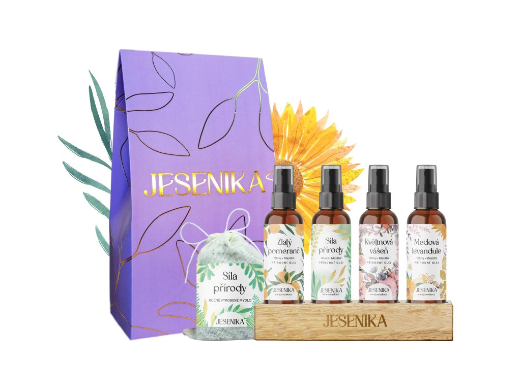 Pro ty, kdo si chtějí dopřát komplexní péči a vytvořit si vlastní rituály plné harmonie a relaxace. Tato sada obsahuje všechny čtyři oleje Jesenika, mezi kterými si můžete vybírat podle nálady a momentální potřeby – ráno vás probudí svěží Zlatý pomeranč, přes den povzbudí Síla přírody, večer naladí na smyslnou atmosféru Květinová vášeň a před spaním uklidní Medová levandule. Nebo je můžete libovolně kombinovat a nechat se vést intuicí. Díky tomu je sada ideální nejen pro individuální péči, ale i pro páry, které chtějí prohloubit své spojení skrze vzájemné masáže.